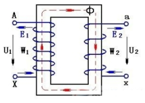 一次繞組(高壓繞組)和二次繞組(低壓繞組)繞在同一個(gè)鐵芯上,鐵芯中的磁通為Ф。