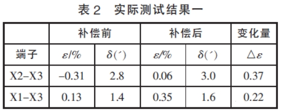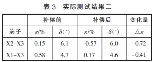 在表2和表3的實測效果中,補償前后相位差改動不大,標(biāo)明本文中筆者舉薦的輔佐電壓互感器規(guī)劃結(jié)構(gòu)漏抗小,對相位差的影響可以忽略不計,與剖析效果一起。